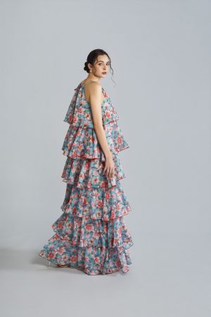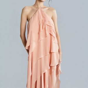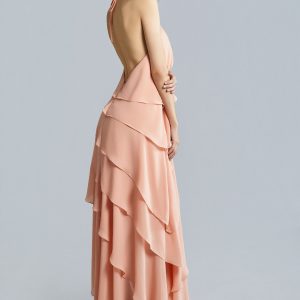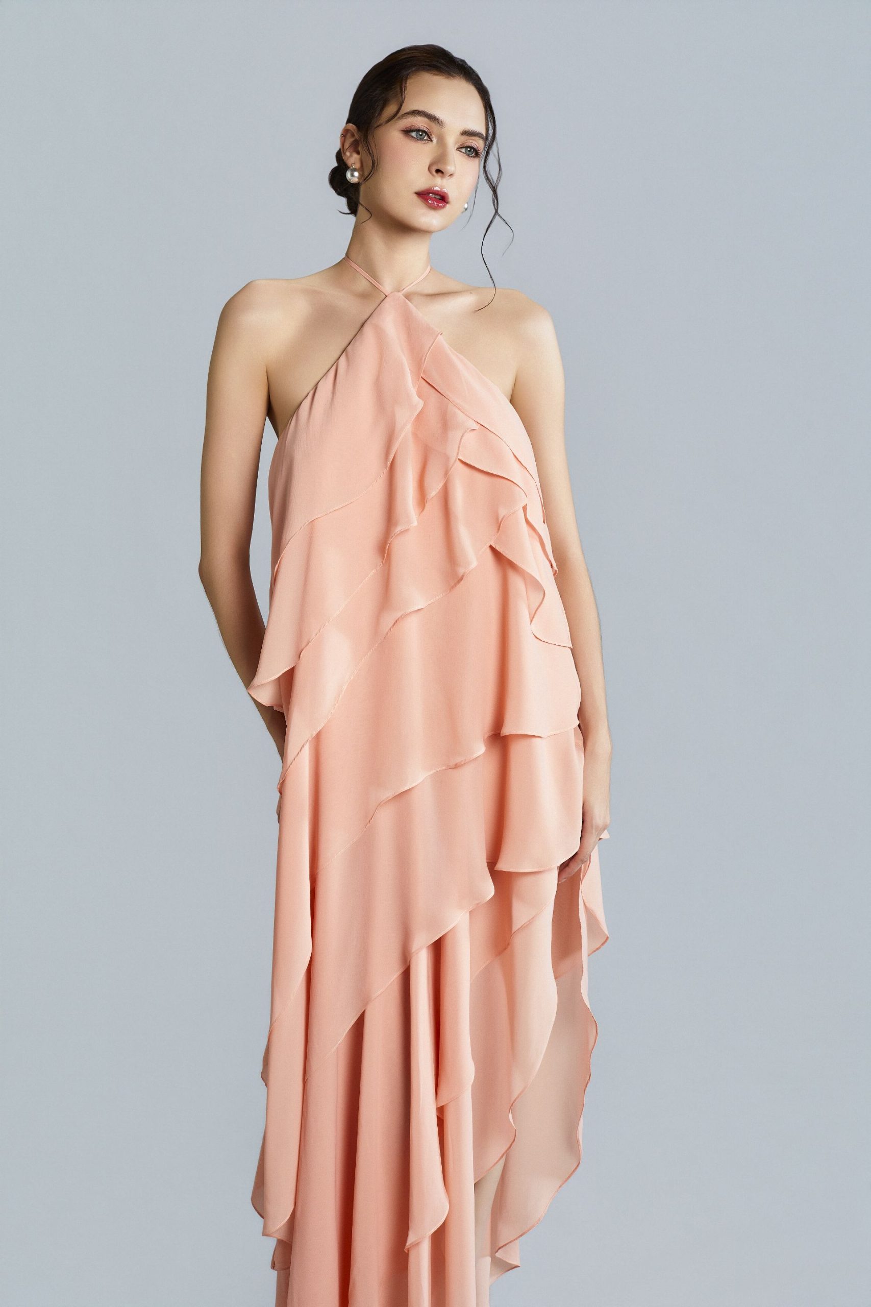 In lustrous Italian chiffon, the Arii dress is a vision of elegance and fluidity. Featuring a delicate blush hue, the halter tie neckline adds a touch of sophistication, leading to an open back that enhances its graceful allure. The dress is adorned with cascading layers creating a sense of movement and depth. Perfect for special occasions or a romantic evening, it embodies timeless glamour.