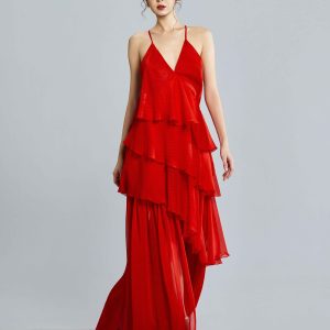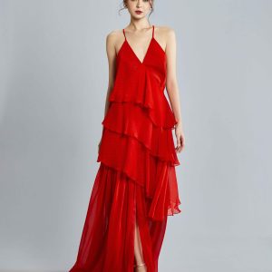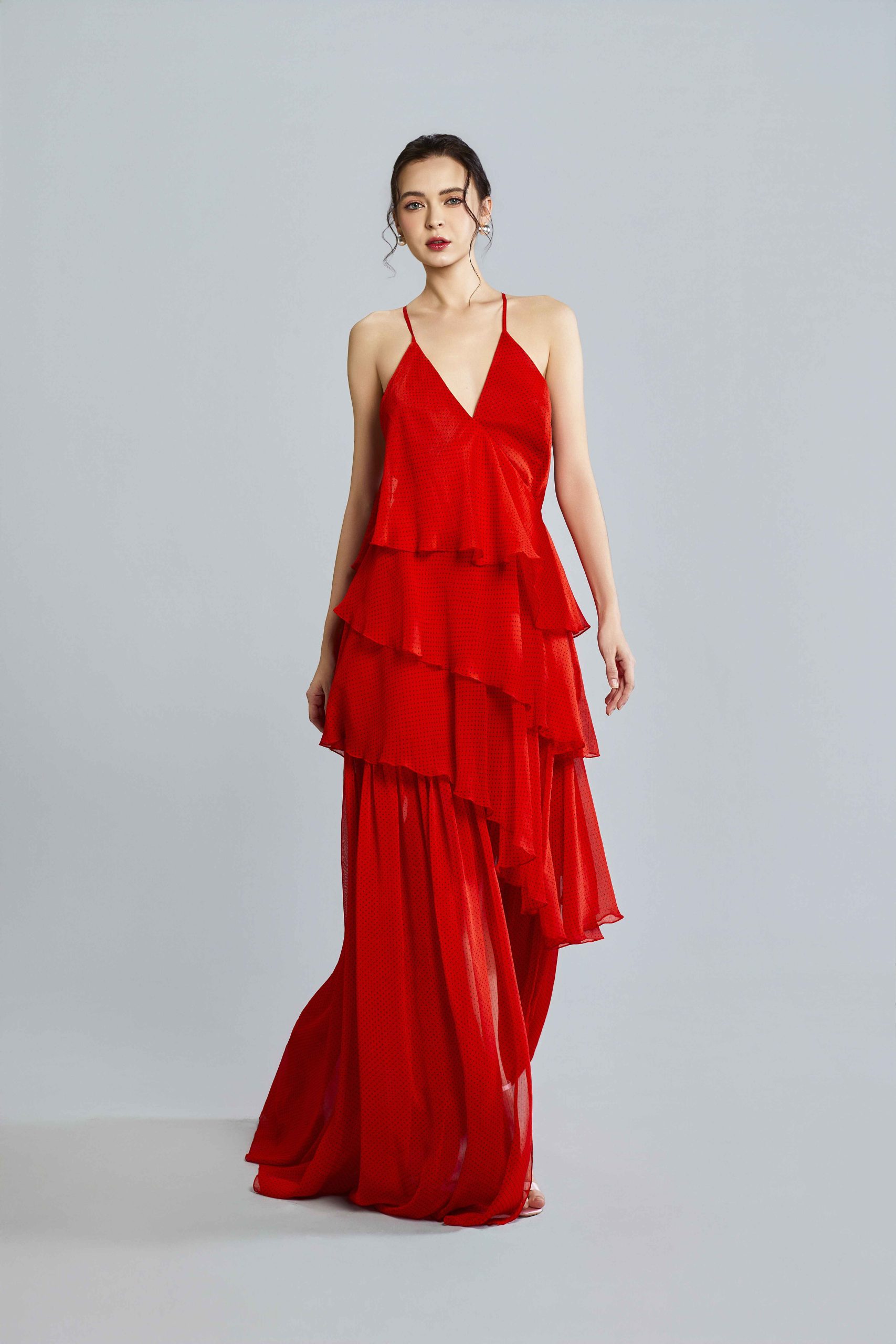 Gorgeously layered chilli red chiffon with black polka dots and delicate halter tie-back straps creates the most flattering silhouette in the Lilly dress. Light, airy tiers sway with every step for a romantic ethereal silhouette perfect for afternoon soirées, garden wedding and sunset receptions. Subtle shimmer catches the light for a dreamy finish. Style with metallic strappy heels to complete the look.