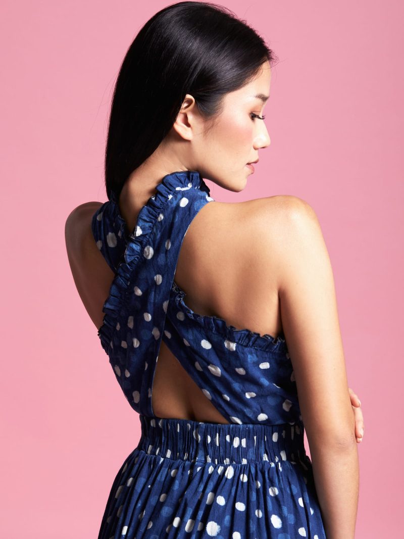 Easy elegance with delicate shoulder ties and a refined midi silhouette, the Nala is beautifully crafted in intricate Malaysian batik. With stunning splashes of blue hues this playful sleeveless dress has a fitted bandeau bodice and voluminous skirt with signature hand pleated ruffled skirt. The ultimate dress to style multiple ways, the Nala midi dress exudes joy!